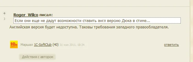 обидно конечно. но по сути как то посратенюшки. Ну будет у меня Дюк говорить голосом Шрека. Ну будут игру озвучивать 2.5 человека. Да как то пофиг. Я буду играть не ради голоса Дюка, а ради чумового экшена в этой игре. Главное, чтобы они своей озвучкой не запароли игру, а остальное как то пофиг. Я не оригиналоанглофил. Как по мне, главное чтобы я понимал суть. А если реально припрет, куплю игру с английской озвучкой.