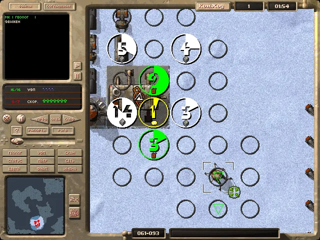 Если хочется закончить строительство здания-техники-бойца за меньшее количество ходов, то для этого надо потратить дополнительное количество ресурсов. Ресурсы добываются с помощью шахт, которые покрывают четыре игровые клетки. Но вот вопрос - а где здесь металл, топливо, золото - основные полезные ископаемые, на которых построена здешняя экономика? Недра здешних планет для нас пока тайна за семью печатями, но вот берём под свой контроль робота-геолога и включается накладываемая на ландшафт сетка с россыпью пустых или заполненных отметкой ресурса кружков. Эта накладываемая сетка будет пополняться стараниями геолога, которого можно перевести в режим авто-разведки, а когда понадобится включить её можно будет и отдельно - карта здесь очень богата на различные сетки-фильтры и специальные метки.