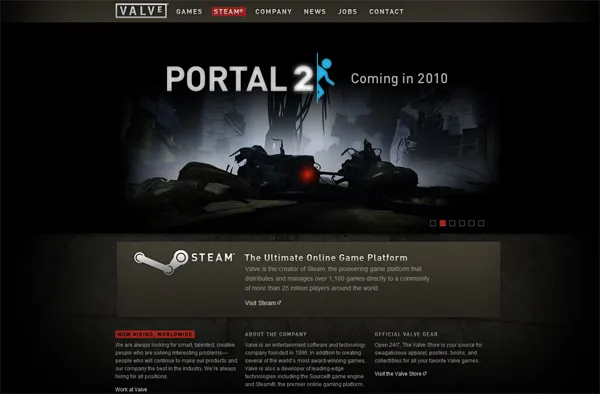 Сегодня Valve сделали себе новую официальную страничку. Выполнено вполне красиво с хорошо доступной информацией для глаз. На главной странице слайдер с продуктами и новостями.