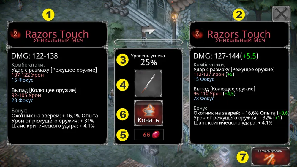 1. Панель улучшаемого предмета. В верхней части панели указывается название выбранного предмета. Обратите внимание на число красного цвета, находящееся слева от названия предмета. Оно обозначает количество улучшений, которое было осуществлено с этим предметом. Под названием указаны свойства, имеющиеся у этого предмета, а также его бонусные возможности.