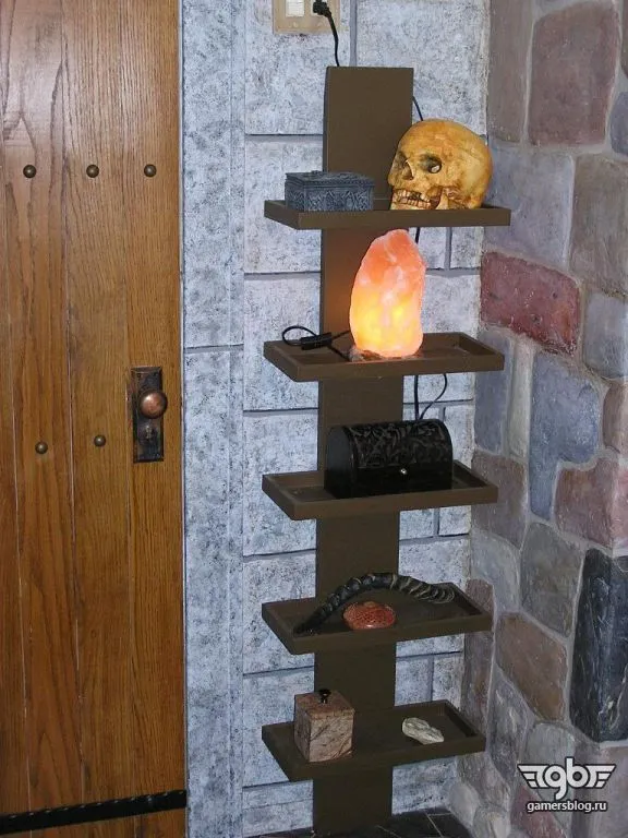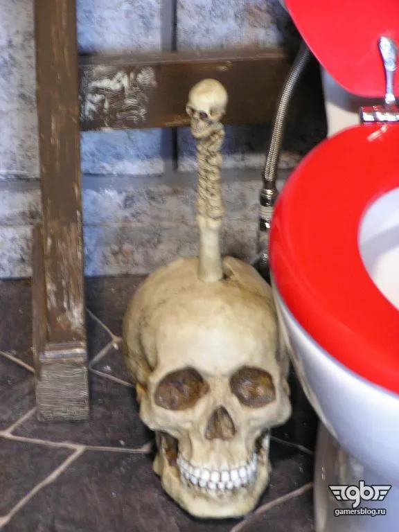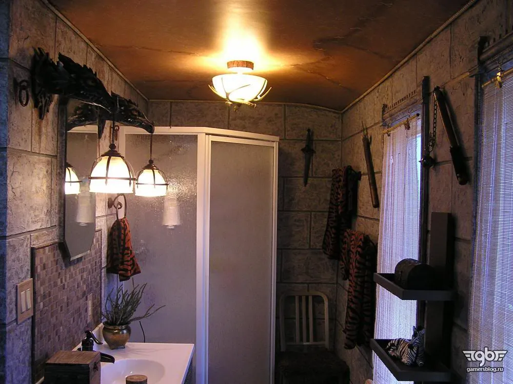 Совершенно бесподобную ванную комнату сделали игроки Пол и Глория в своем доме. Они оба – преданные фанаты World of Warcraft, но помимо рейдов и рейтинговых сражений ухитряются находить время и на ремонт. Все детали декора муж и жена делали сами, в их ванной теперь светильники в форме отрубленных голов драконов, настоящий шкаф с зельями, отделка стен под камень и «зашитый» потолок. Весь процесс супруги фотографировали, его красочная летопись есть в Интернете. Посмотрите сами, как много труда вложено в эту работу. Никакой, даже самый откровенный, косплей с этим не сравнится.