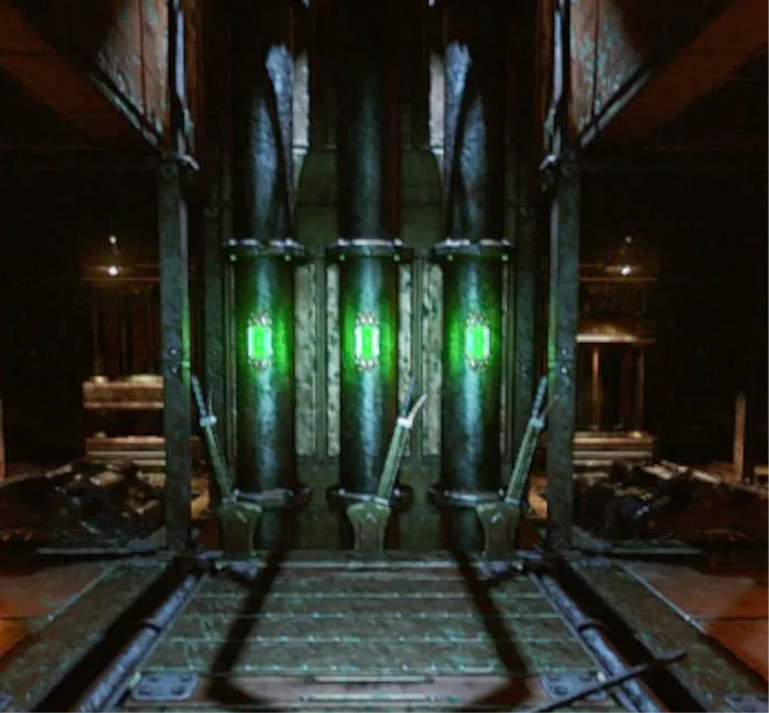 11. Секрет. Чтобы попасть сюда, необходимо нажать на кнопку (10) на востоке. В сундуке вы найдете универсальный двуручный молот Таран (урон 68, 60% шанс отбрасывания, +35% урона механическим врагам), улучшенный разрушитель и ремкомплект.