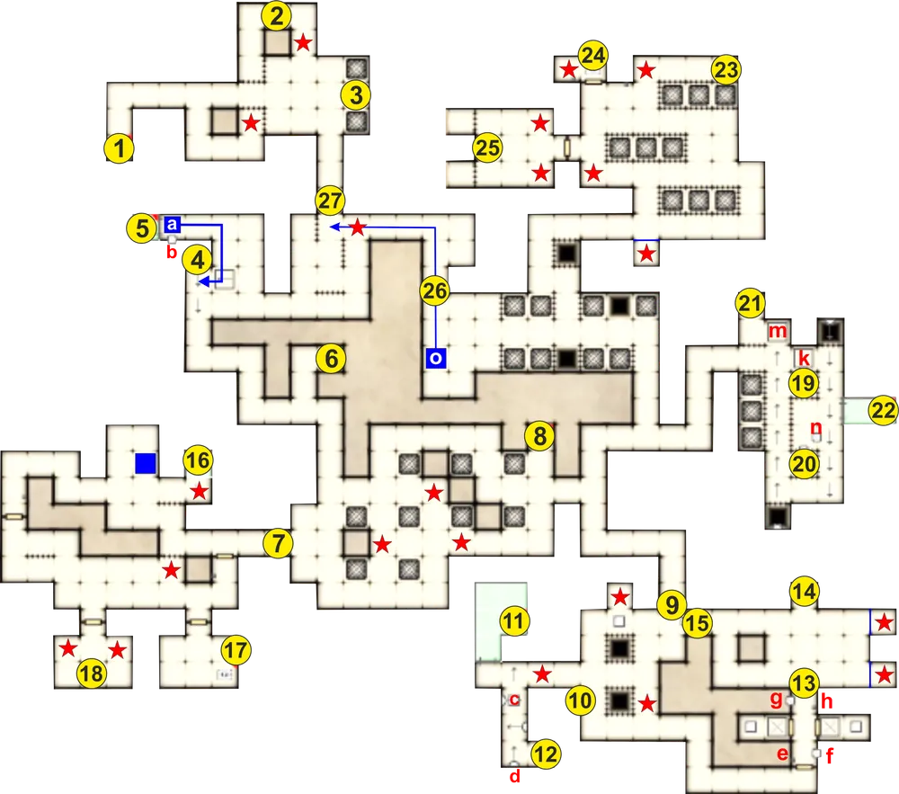 26. Закрытая дверь. Вы сможете открыть ее при помощи рычага, который находится рядом, после того, как запустите водяной насос (25).