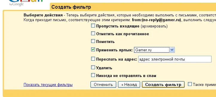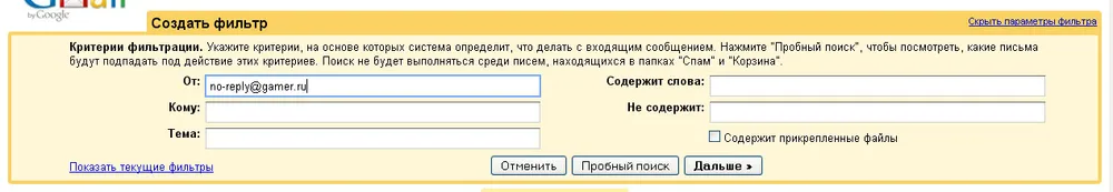 для фильтрации писем от gamer.ru адресат будет no-reply@gamer.ru