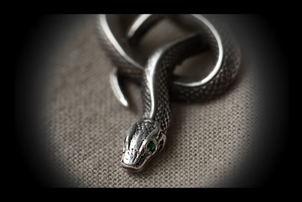 Так вот она, оказывается, какая, "змейка серебряная с одним изумрудным глазком". Шучу, на самом деле, с двумя. И не с изумрудными, а всего лишь с фианитовыми. Оцените, кстати, качество исполнения: головка реальной змеюшки всего-то пять миллиметров в длину и три в ширину.