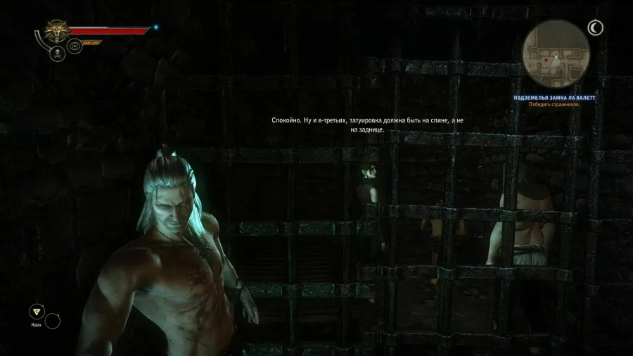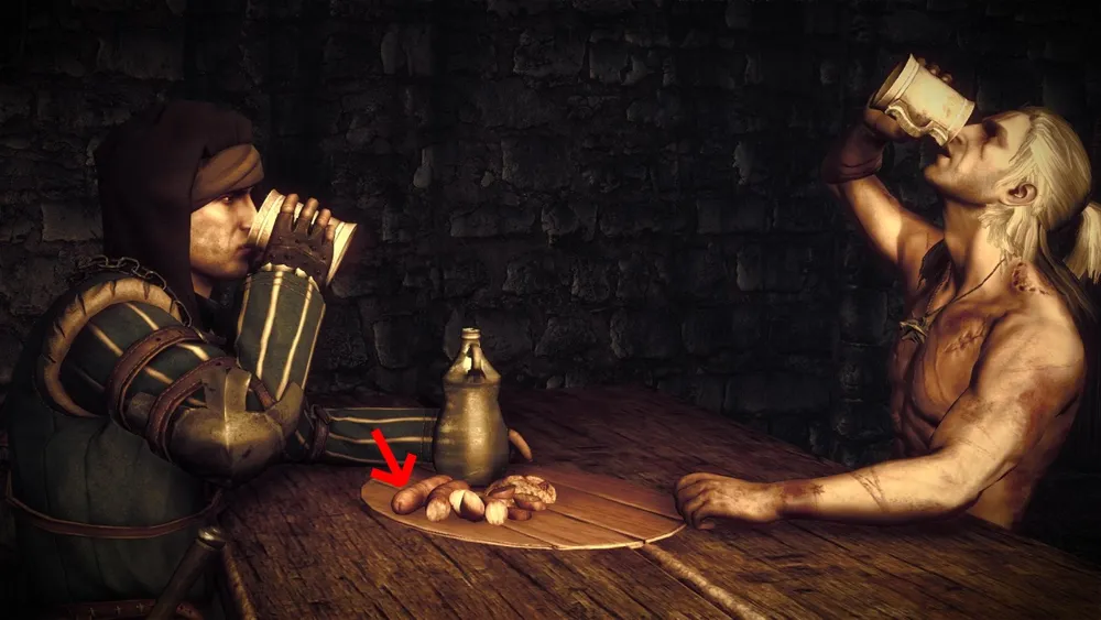 Дальше. Действие тоже происходит в темнице. Пасхалку заметил после повторного прохождения игры. Когда ведьмаку на допросе приносят поднос с колбасами и водой. Так вот, не посчитайте меня извращенцем, но самая крайняя левая колбаска очень смахивает на половой член.))