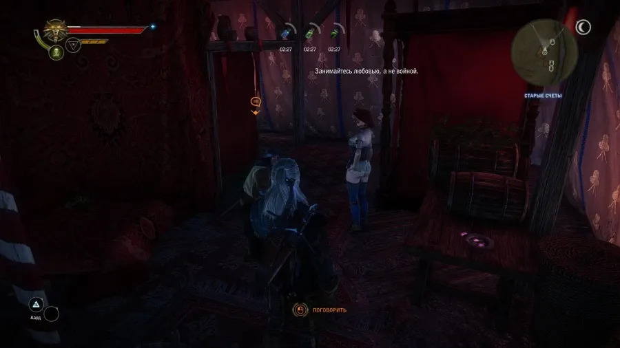 Бордель (большая палатка). Одна из шл.. дам говорит: "Занимайтесь любовью, а не войной!" Отсылка на песню Джона Леннона - «Mind Games» или девиз движения хиппи.