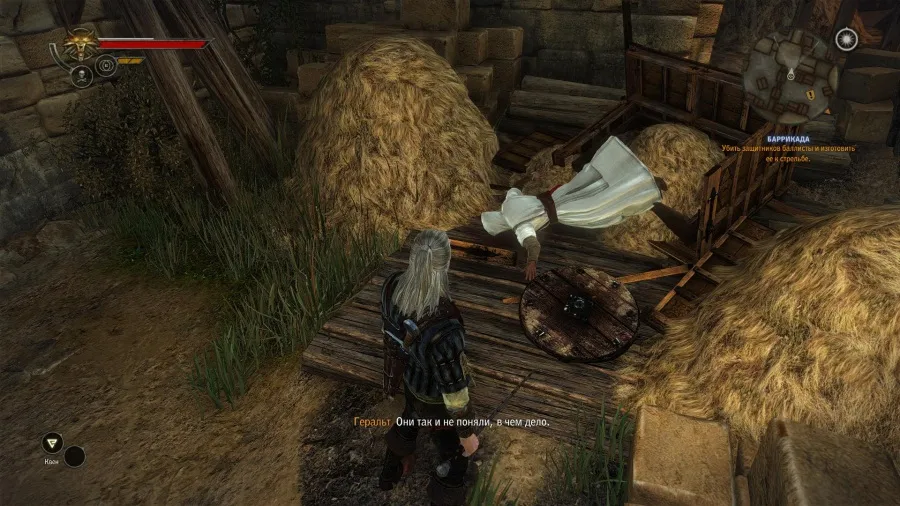 За баллистой стоит разбитая повозка с сеном, а там лежит человек в белом, в капюшоне и красной повязкой на поясе - отсылка к игре Assassins Creed.