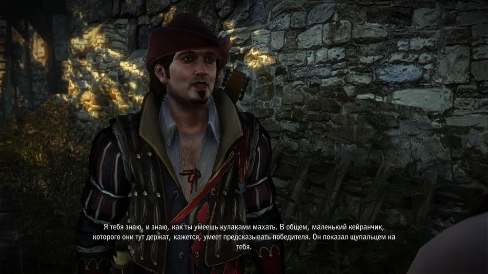 Квест "Бойцовский клуб". Если в последнем бою принять предложение Лоредо и проиграть бой, то нас вынесут на улицу. Подойдёт Лютик и скажет что то вроде этого: "Маленький кейранчик, которого они тут держат, умеет предсказывать победителя".