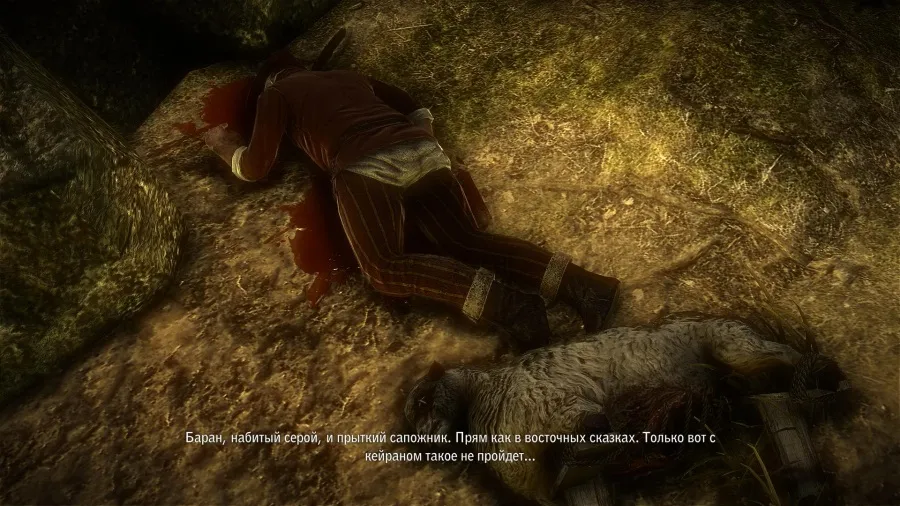 Не долеко от входа в логово лежит мёртвый человек - сапожник, а рядом овца. Отсылка к одной из легенд (или книжки, не помню) про дракона, который ел животных и людей. Сапожник подбросил дракону барана, начиненного серой. Дракон проглотил его и сдох. Но с кейраном такое не прокатило.