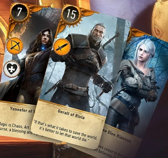 "В свое время Геральт приобрел славу искусного игрока в покер на костях. Поскольку он победил всех мастеров этой игры, ему не оставалось ничего иного, как переключиться на другие игры и собирать лавры на новом поле. Он выбрал гвинт. Поскольку Геральт собирался играть на высшем уровне, он решил собрать полную коллекцию карт, включая те, которые можно было отыграть только у лучших игроков."