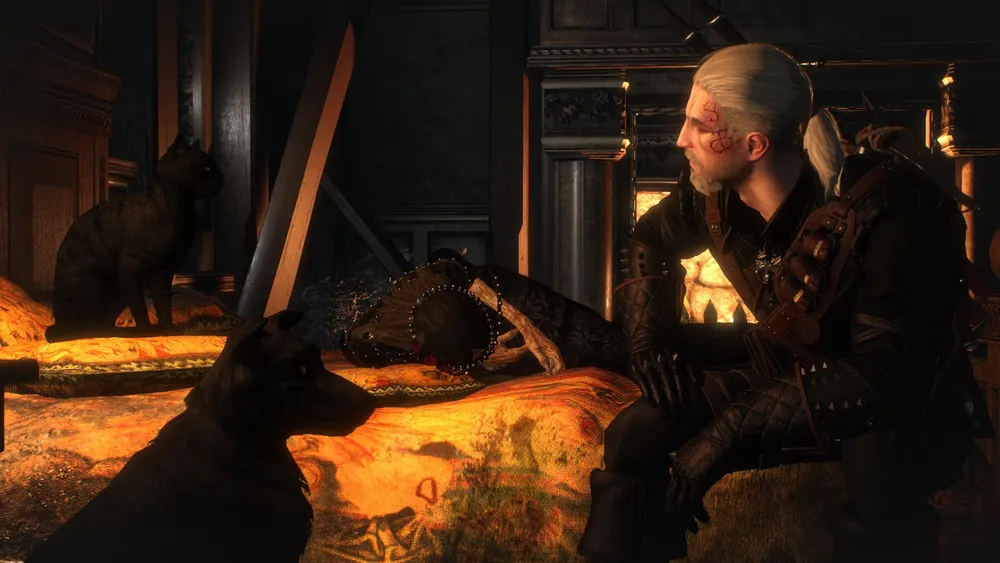 Кошке и псу это воспоминание окажется знакомым, ведь они вместе со своей хозяйкой провели в этом месте много времени. В молчании. Животные займут свои места, как тогда. Всё остальное придется делать ведьмаку. И снова включаем ведьмачье чутье и собираем разбросанные по залу предметы. Найденную маленькую миску нужно поставить возле кошки, большую миску – возле пса, а поднос вложить в руки попортившему нам ранее столько нервов Ключнику. Проделав все эти манипуляции, отходим в сторонку и смотрим завершающую сцену.