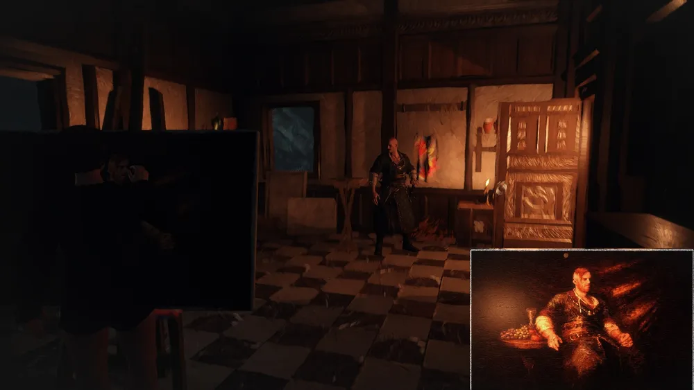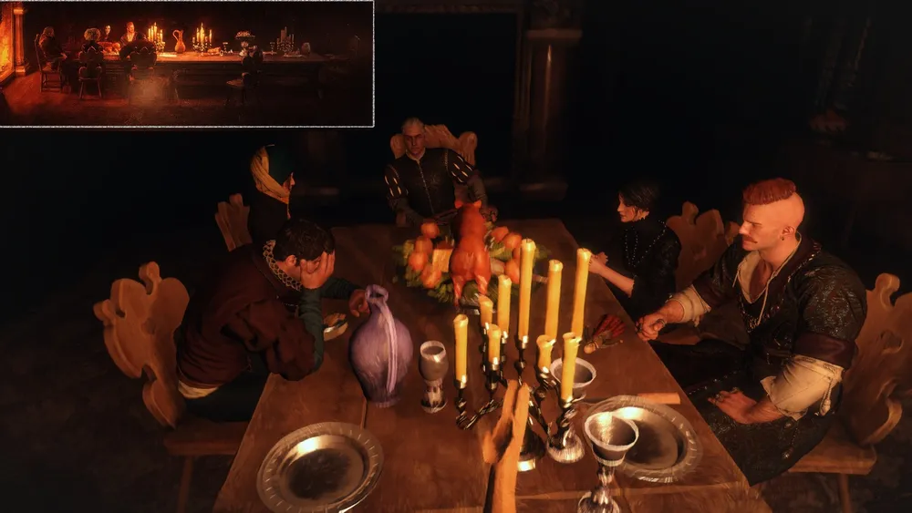 В мастерской ведьмак найдет и приберет себе чашу с фруктами и кубок. Ведьмачье чутье подскажет, что поставить эти предметы нужно на столике возле Ольгерда. Вот только в каком порядке? Можно, конечно, перебрать все варианты, ведь поставить предмет не на то место игра нам не позволит. Однако проще всего взглянуть на портрет, который пишет Ирис, и сразу порядок расположения фруктов и кубка станет понятен (виноград слева, кубок посередине, яблоко справа). Итак, все предметы на месте, смотрим следующую «серию».