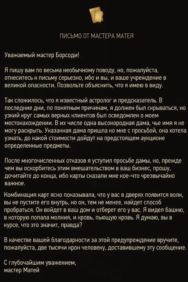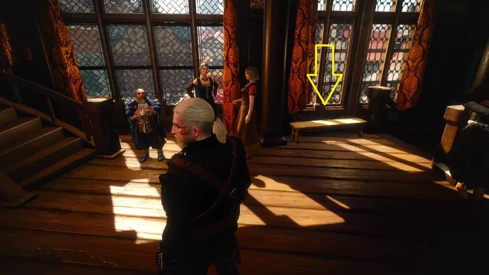 Сам аукцион будет проходить на втором этаже, и пока он не начался, Вим захочет представить Геральта нескольким своим интересным знакомым. Общаться с ними или нет – решайте сами. Дело это сугубо добровольное. Лавочка, что удобно расположилась у окна, избавит нас от беседы с чванливыми сливками общества.