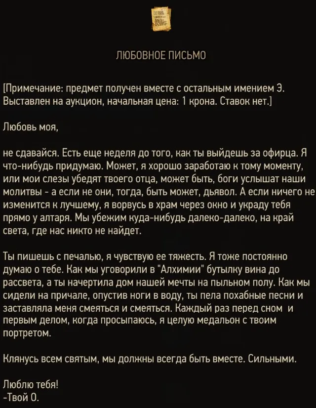 Теперь же нам предстоит встретиться с самым большим страхом Ирис фон Эверек. В соседнем зале будет лежать на столе прощальное письмо Ольгерда жене. Он решил оставить имение Ирис и уйти, чтобы не причинять ей вред.