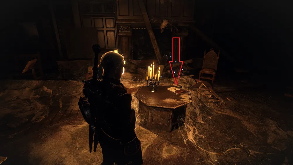 Добравшись до балкона на чердаке дома профессора, выбиваем двери «Аардом». От такого удара ветхие балки в доме потрескаются и начнут угрожающе поскрипывать. Спускаемся вниз и по пути обшариваем второй этаж дома, где обнаружится разбитое зеркало и книга о демонах. Самого же профессора мы найдем на первом этаже, сидящим в каком-то круге с начертанными в нем рунами.