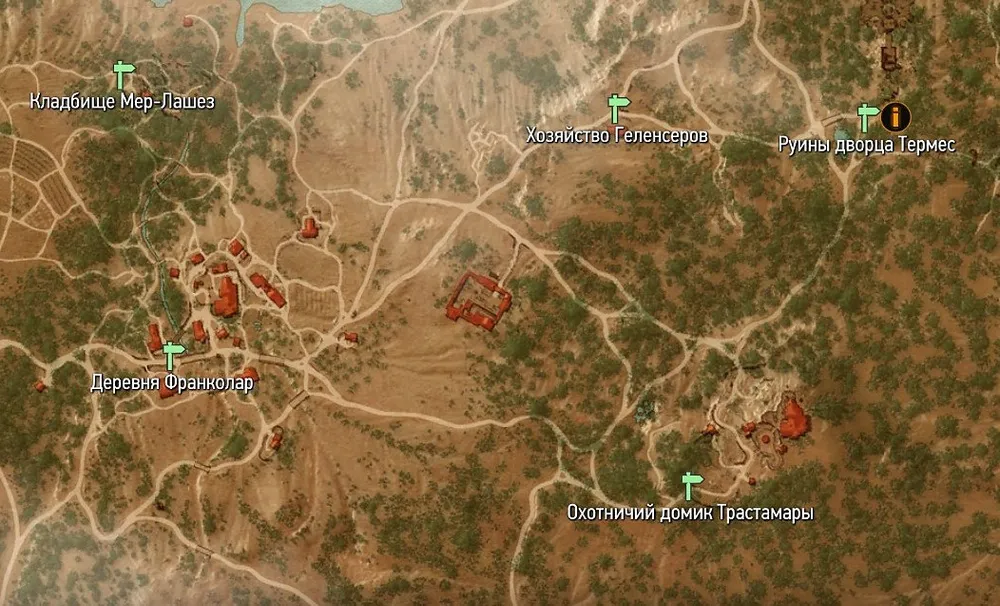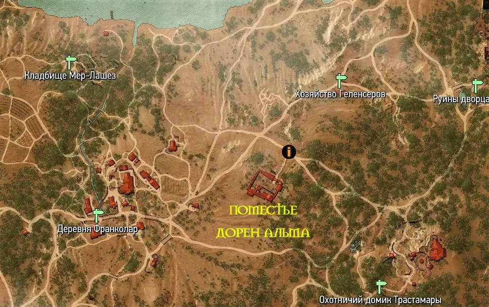 На востоке от деревеньки Франколар на живописном холме располагается поместье Дорен Альма. Возле него на дороге взору проезжающего мимо ведьмака предстанет необычная картина: в луже крови будет сидеть раненый человек, одетый в странные старинные доспехи, а другой – по имени Гастон – будет пытаться оказать ему первую помощь.