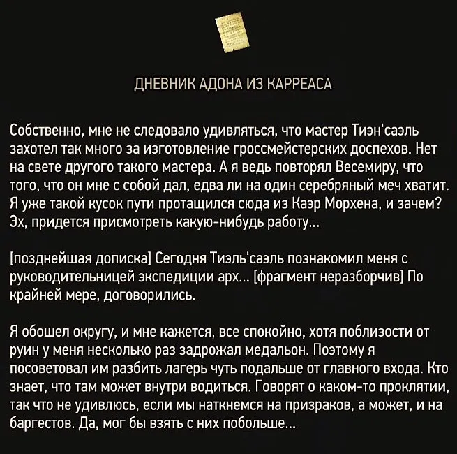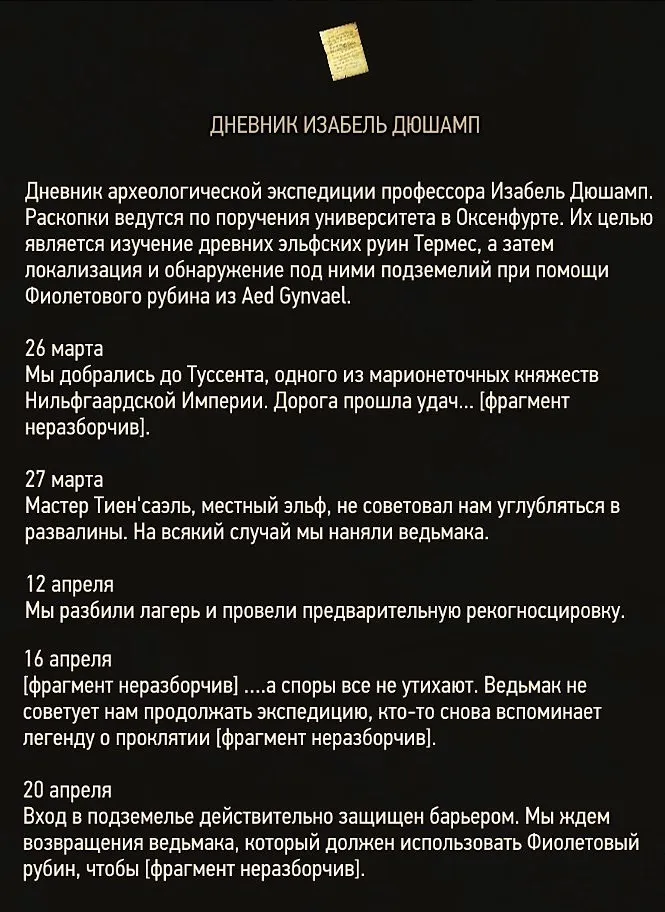 А искать необходимо возле руин замка Термес, где встали лагерем археологи и нанятый для их охраны ведьмак. В самом лагере ни души, и лишь дневник одного из учёных прольёт свет на дальнейшие шаги экспедиции.
