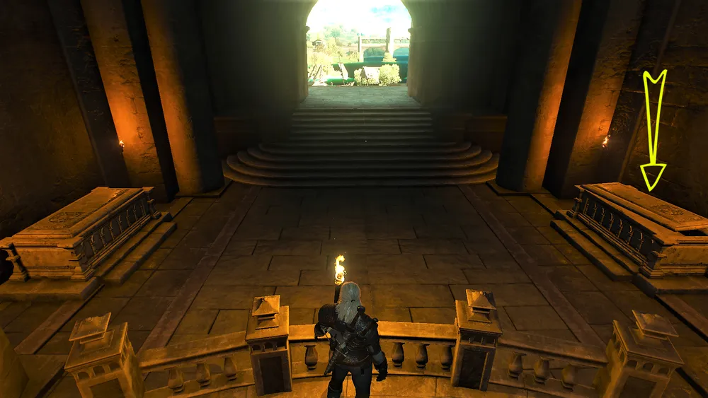 Как только вы прочтёте дневник, игра укажет, куда дальше отправилась экспедиция. Вход в подземелье будет в северо-восточной части руин, однако путь внутрь ведьмаку преградит магический барьер. Чтобы его отключить, необходимо отыскать фиолетовый рубин, который, к счастью, долго искать не придётся, ибо находится он рядом с входом возле скелета.