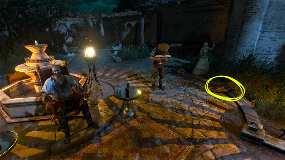 Как только Дюран, играющий роль Людовика, начнет свою речь, статуи, что стоят по периметру, вдруг чудесным образом оживут и нападут на реконструкторов. Дюран и Гастон спрячутся, а ведьмаку придётся сражаться с четырьмя эльфскими копейщиками и двумя чародейками, использующими магию огня. Бой этот окажется крайне сложным, особенно на высоких уровнях сложности. Места крайне мало и очень много различных препятствий, где противники могут зажать и изрядно покалечить нашего героя. Потому мой совет таков: как только начнётся бой, не мешкая улепётываем по лестнице к имению и там уже готовимся планомерно изничтожать супостатов. Благо наверх за ведьмаком они не последуют.