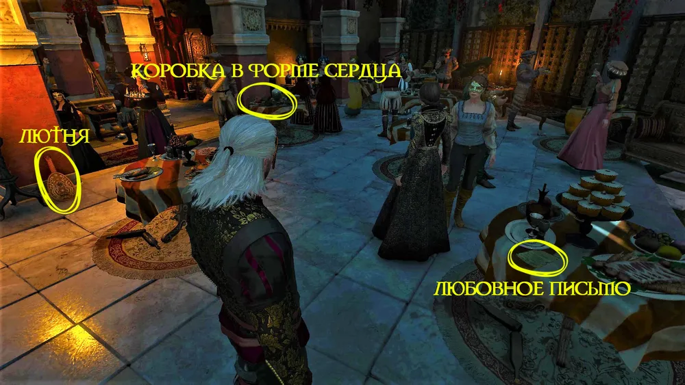 Осмотр с помощью ведьмачьего чутья столиков с яствами принесет свои плоды. На одном из них обнаружится та самая коробка в форме сердца, подаренная Сесилии Цинтрийцем.