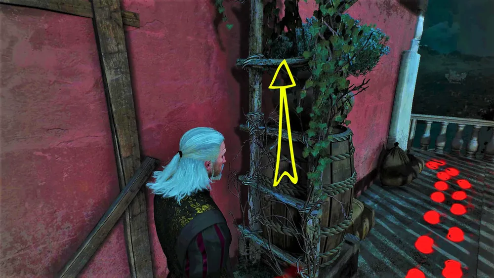 Следы грязных сапог приведут ведьмака к поросшей вьющимся растением лестнице, ведущей на балкон этажом выше.