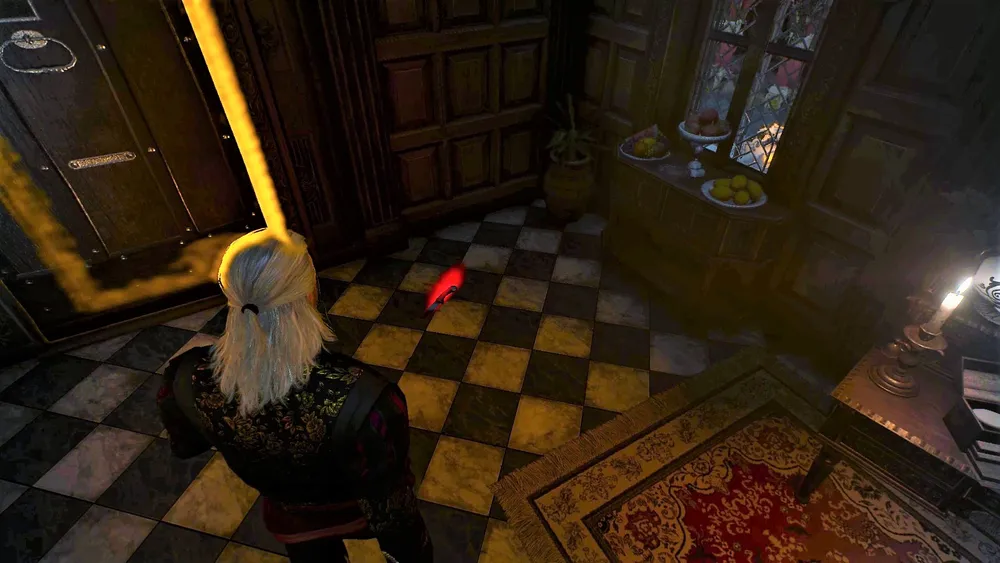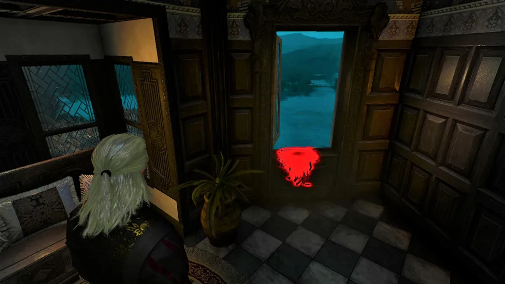 Забравшись по лестнице, Цинтриец с балкона проник в другую комнату, однако на момент появления там Геральта, его в комнате уже не было. Но вот наследил Цинтриец там порядочно. Для того чтобы составить полную картину произошедшего в комнате, желательно осмотреть все «покрасневшие» места. Но для продолжения сюжета достаточно осмотреть туалетный столик возле кровати и забрать оттуда драгоценность с большим жёлтым камнем, возле двери подобрать окровавленный нож, осмотреть открытое окно со следами крови на подоконнике.