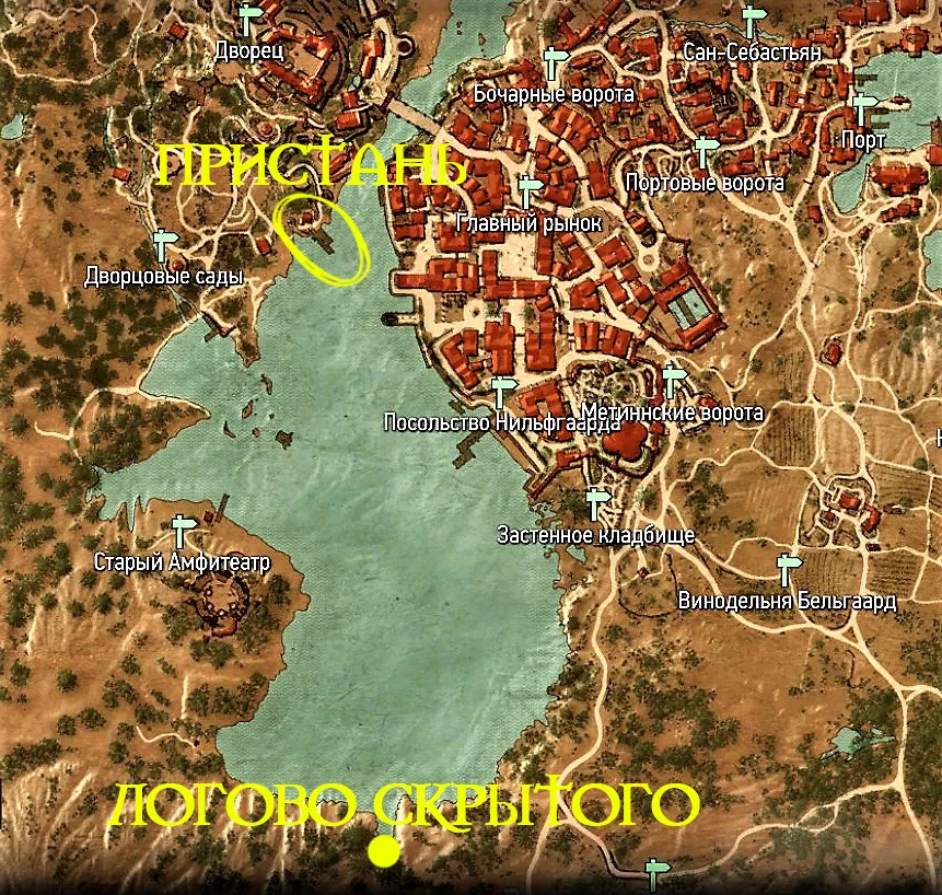 На дереве возле приюта за ведьмаком наблюдают верные Регису птицы. Вот через них Геральт и назначит Регису встречуна пристани во дворце. А сам ведьмак может отправиться туда самостоятельно, либо игра сразу перенесёт его на место встречи (реплика «Идти на встречу с Регисом»).