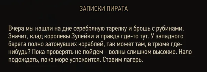 2. Прочтение записок активирует задание. Если квестовый сундук к этому моменту уже был обобран, оно завершится сразу же после активации. В противном случае то, что пираты приняли за клад Зулейки, матери нынешнего короля Ковира Танкреда, придется поискать. И да, снова понадобится лезть в воду, нырять... Посудина с сокровищами затонула полностью, с берега ее не видно, как ни высматривай. Лежит она в непосредственной близости от того места, где Геральт будет искать квестовое добро по заданию «Дорогая ошибка» (см. ниже). Чтобы добраться до кованого сундука, нужно сперва попасть в трюм, а сделать это можно только через отверстие в палубе на носу судна. Заплываем внутрь, поворачиваем направо и вот он – сундучище. Как только ведьмак его откроет, задание завершится. И не забудьте обобрать мега-ракушку рядышком – в ней тоже есть лут.