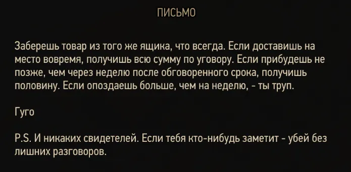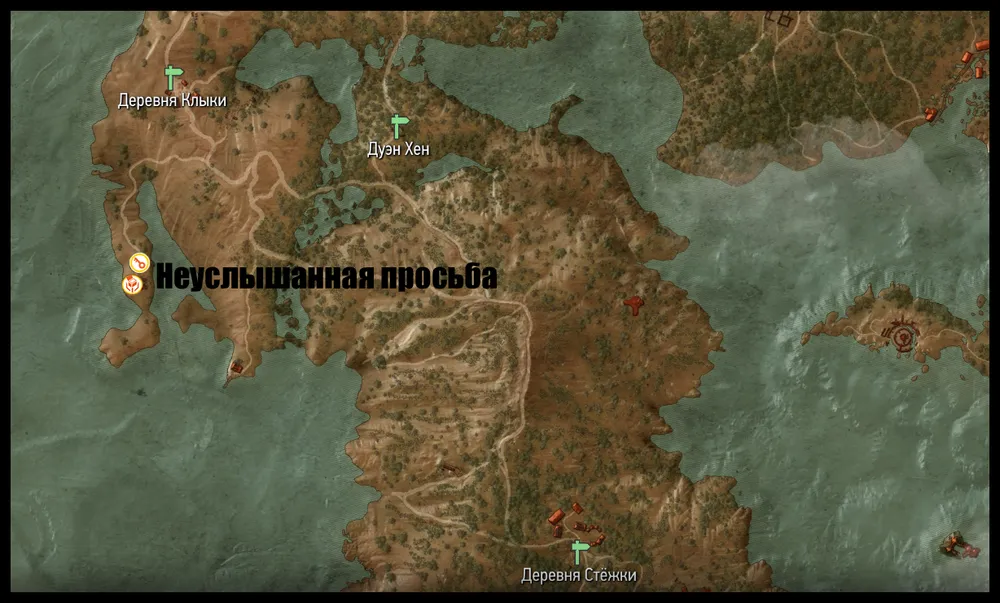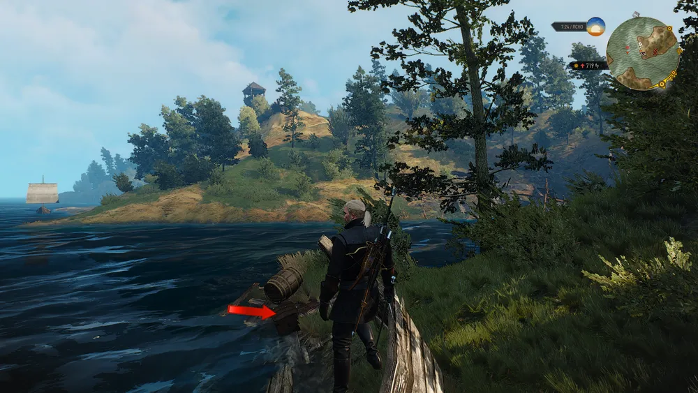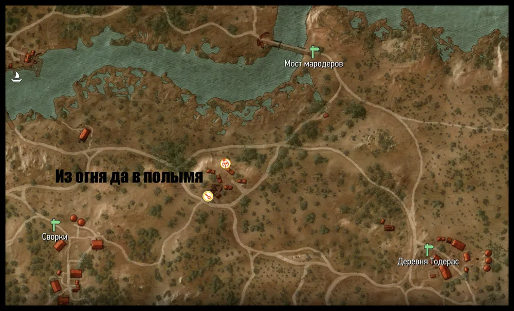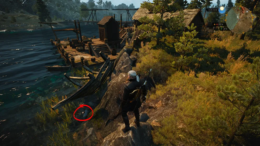 1. У восточной оконечности брошенного селения, точнее пристани, за развалившейся лодкой, в воде у самого скалистого берега полусидит мертвец. При нем Геральт найдет неотосланное письмо, в котором говорится о каком-то затонувшем в реке сундуке и лихе, что обитает в том месте под водой. Как только письмо будет прочитано, активируется квест.