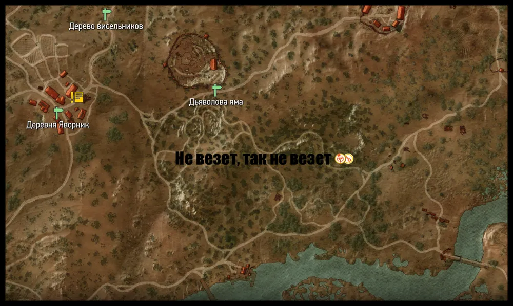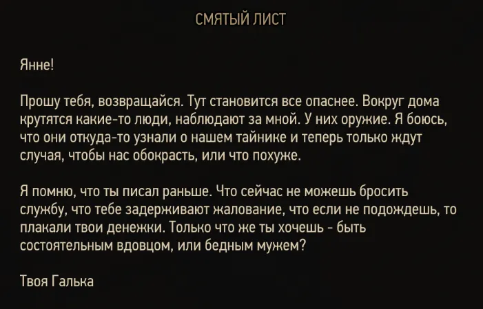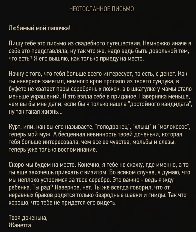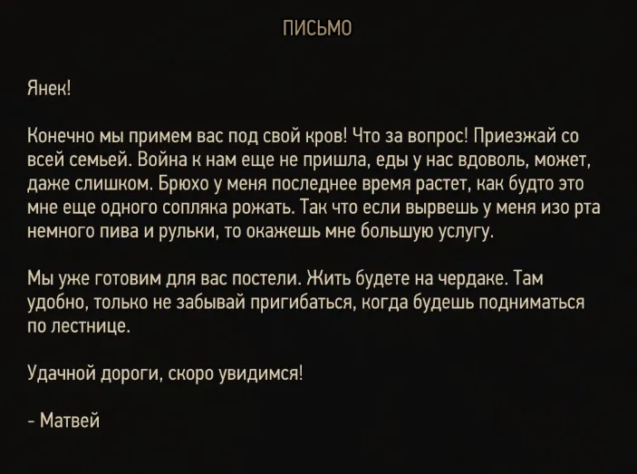 1. Скитаясь по лесам и перелескам между Дьволовой ямой и речной протокой, Геральт может столкнуться со следами еще одной трагедии, постигшей жителей этого забытого богами края. Телега, перевозившая нехитрый крестьянский скарб. Мертвый хозяин, привалившийся к ней. Чуть в стороне еще два окровавленных тела – женщины и мальчонка. Сгусток клубящегося, будто живого, тумана, окутывающего телегу, выдает присутствие туманника (4 уровень) – виновника гибели целой семьи. Впрочем, для ведьмака он не представляет особой опасности. Покончив с монстром, наш герой осмотрит труп мужчины и найдет при нем букетик цветов и письмо.