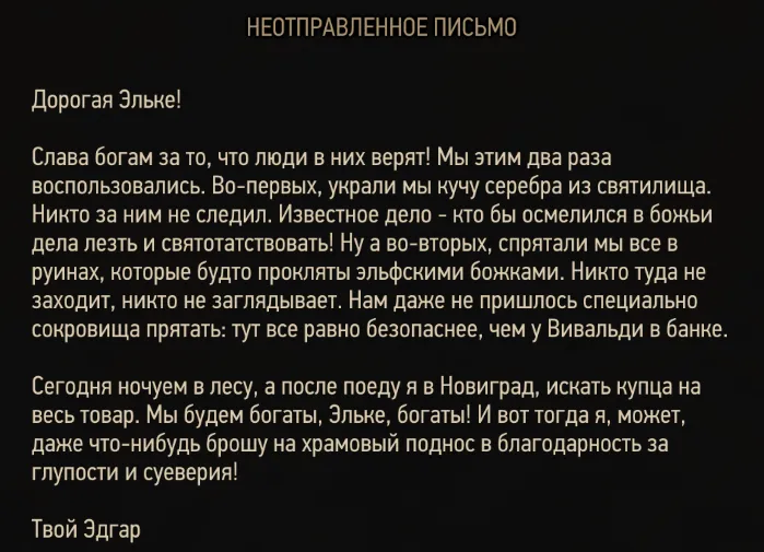 1. Ведьмак по опыту знал: эльфские руины – место скверное. Вот и на сей раз, заглянув в старинные развалины, он столкнулся с пятью призраками 13 уровня. Когда с ними было покончено, и у Геральта появилась возможность спокойно осмотреться, он понял, что был далеко не первым, кто отважился сюда забрести. Но в отличие от своих предшественников он хотя бы остался жив. На теле кмета, привалившегося к основанию колонны, ведьмак найдет неотправленное письмо и ключ от сундука.
