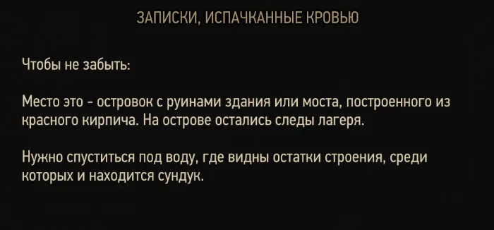 1. От кирпичного сооружения на крохотном островке южнее Коломницы остались одни развалины. Казалось бы, зачем соваться туда? Однако глупцы, как известно, находятся повсюду. Вот и еще один кандидат на премию Дарвина сложил свою дурную голову в погоне за сокровищами. Разобравшись с четырьмя утопцами 4 уровня, весело скакавшими вокруг трупа, Геральт пошарил у мертвеца по карманам и нашел записки, испачканные кровью. Так и есть, мужик искал богатства, а нашел свой конец. Однако это вовсе не значит, что наш герой не должен попытать счастья...