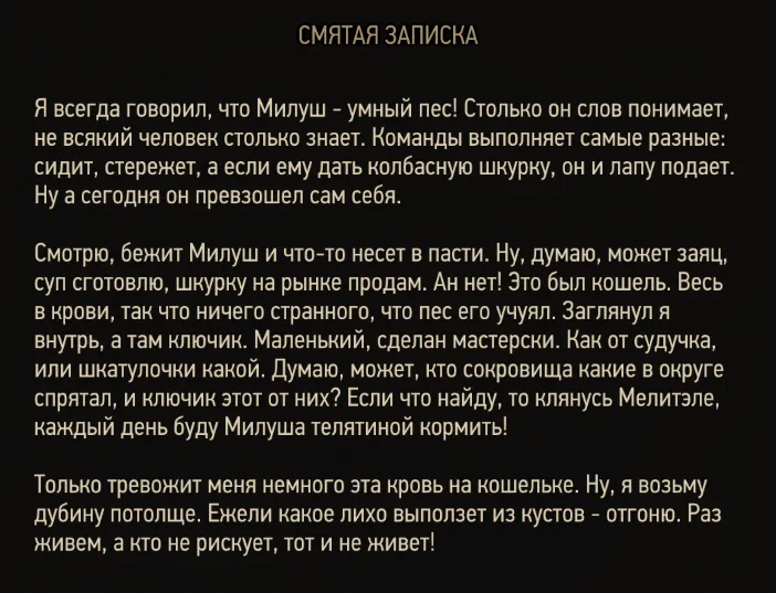 1. Тяжела и опасна жизнь в Велене. Если действующая армия да дезертиры стороной обойдут, так чудища, коих по лесам и болотам водится немерено, на куски порвут. И неважно им, честный ли ты человек или бандит какой – любого сожрут и не подавятся. Вот и бес (22 уровень), обосновавшийся на южной окраине Кривоуховых топей, не стал отказывать себе в удовольствии полакомиться человеченкой. Разобравшись с чудищем, Геральт сможет не торопясь осмотреть останки убитых им людей. На теле мужчины он найдет ключ и записку бандита.