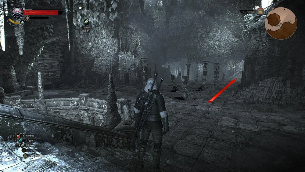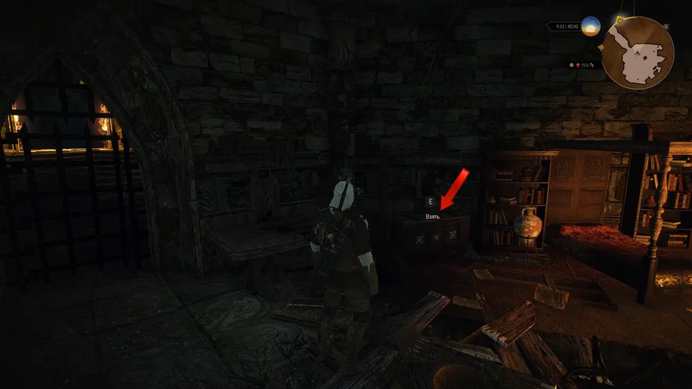 В самом убежище царит изрядный беспорядок. Стоит врубить ведьмачье чутье и обследовать помещение. Квестовый предмет, полированный кристалл, обнаружится в правой части залы, возле колонны, увитой плющом. Как только Геральт его подберет, задание обновится.