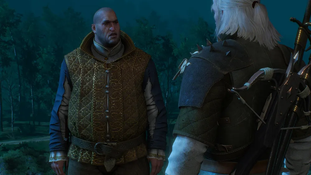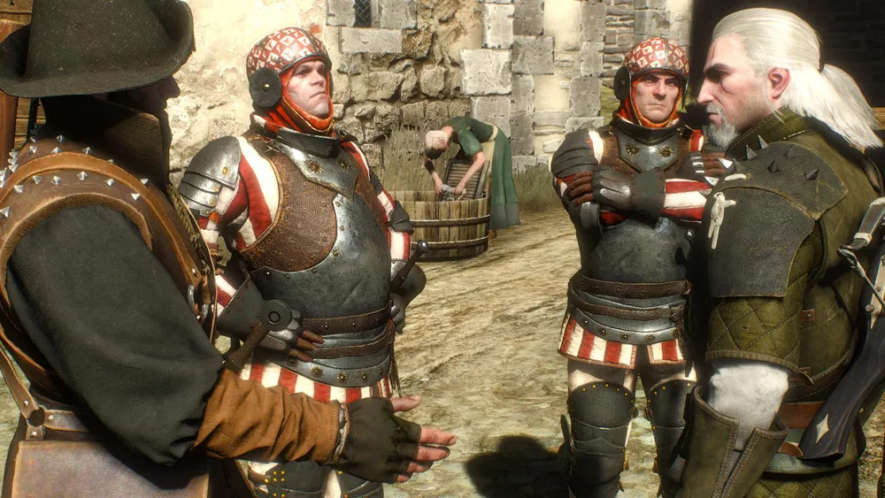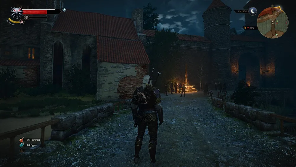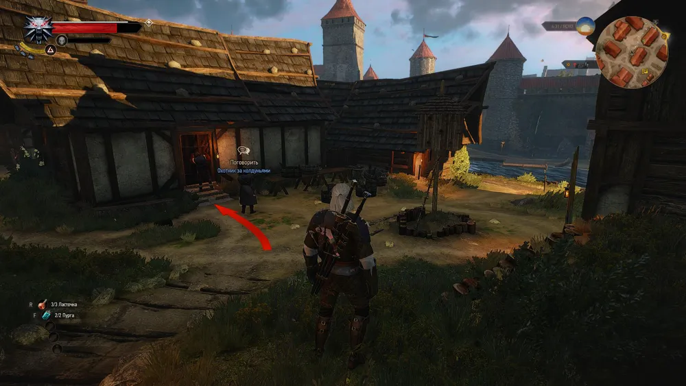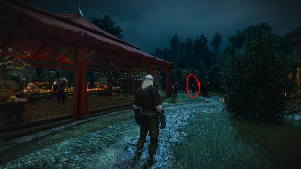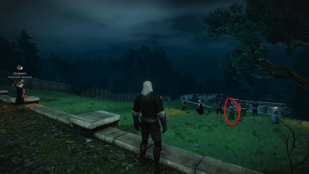 С восточной стороны здания топчутся два стражника и один охотник. Они являются неотъемлемой частью квеста и присутствуют при любых условиях и раскладах. На ведьмака эти ребятки реагируют, только если он подойдет к ним и попытается заговорить. В зависимости от того, как наш герой отреагирует на их угрозы: огрызнется (реплика: «Повежливей») или предпочтет не лезть на рожон (реплика: «Уже ухожу»), дело закончится либо схваткой (три противника 14 уровня), либо миром. Будучи убитыми, они не респавнятся.