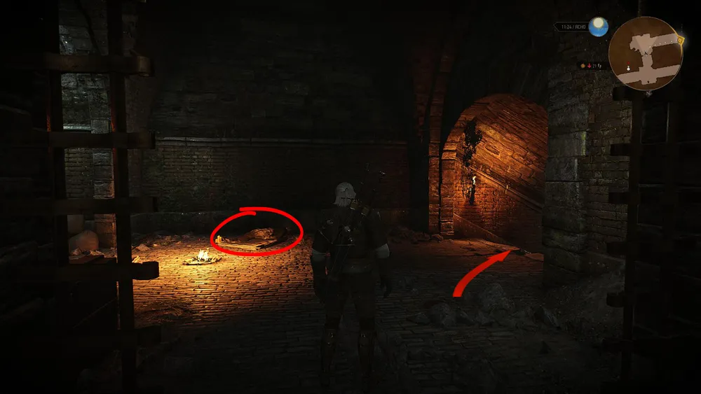 Преодолев первый пролет, поворачиваем направо. Прямо перед собой Геральт заметит труп бомжика. Его определенно стоит осмотреть. Тело бледное, иссушенное – плохой знак.