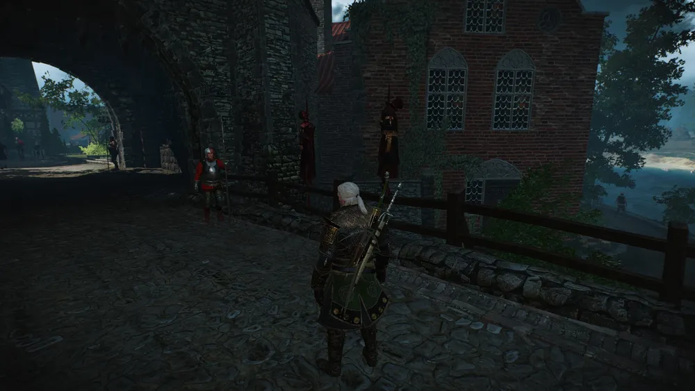 В очередной раз следуем за Трисс. По дороге она может снова попросить нас укрыться за углом дома от проходящего мимо патруля. Если Геральт прислушается к ее словам, то ничего не произойдет. Если же он, не обратив на них внимания, ломанется вперед, то ему придется обнажить меч (три противника 13 уровня).