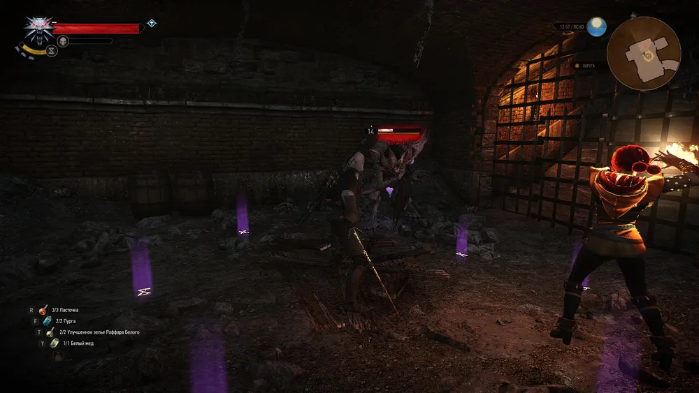 7. Портал перенесет Геральта на нижний уровень подземелья. Выйдя из него, он увидит перед собой зал с несколькими обгорелыми трупами. Самое время приготовиться к бою, ведь впереди нас ждет схватка со стражем Филиппы – ифритом, или огненным элементалем. Смажьте меч маслом против магических тварей, приготовьтесь тушить полыхающего огнем громилу Аардом и двигайтесь вперед навстречу судьбе.