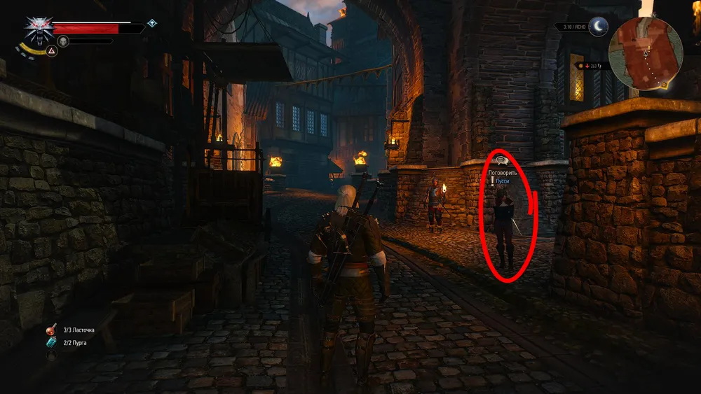 4. Отправляемся за Бертольдом и Аниссой. Трисс покажет дорогу. Если чуть ранее Геральт сумел избежать столкновения со стражниками, дежурившими у дома Трисс, или они его проигнорировали, то теперь бойцы без лишних слов нападут на ведьмака и рыжеволосую чародейку, стоит тем только выйти на улицу (три противника 14 уровня). В этом случае Геральт будет биться не один – магичка поможет ему файерболами. По окончании схватки продолжим путь. В какой-то момент наша спутница заметит патруль и предложит подождать, пока он пройдет мимо, скрывшись за углом здания. Если Геральт прислушается к ее словам, то ничего не произойдет. Если же он, не обратив на них внимания, ломанется вперед, то ему придется обнажить меч (три противника 13 уровня).