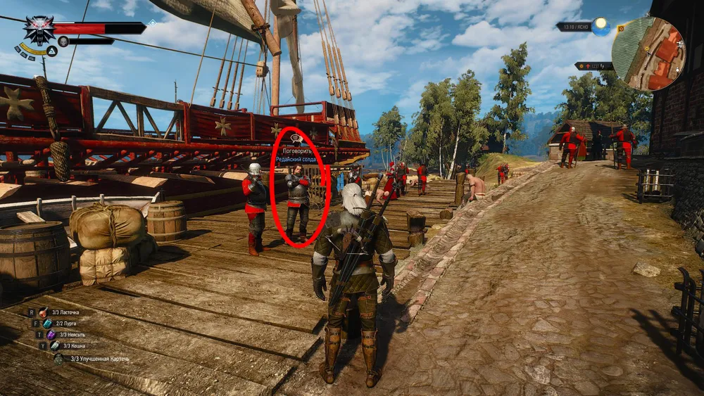 11. Вне зависимости от того, имеет ли Геральт при себе кристалл или нет, он вынужден доложить о проделанной работе августейшему заказчику. Радовид находится на борту своего корабля в порту Оксенфурта. Поговорите с реданским солдатом (4) на причале, и он отведет вас к монарху.