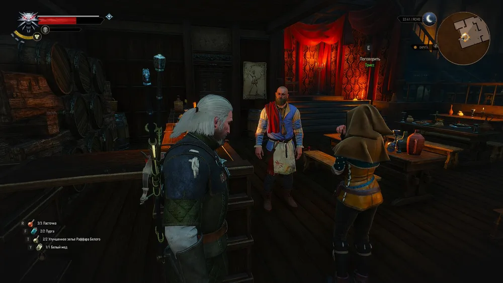 Если ведьмак сумел все разрулить по-мирному или стражники попросту проигнорировали его, то, поднявшись на второй этаж, он станет свидетелем того, как хозяева вымогают у Трисс дополнительную плату за проживание.