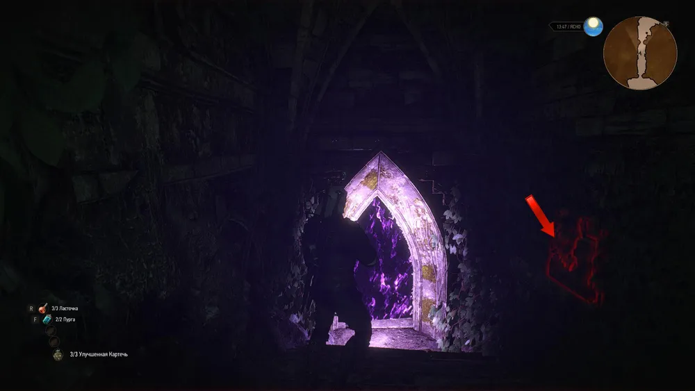 2. Самое время спуститься вниз и приступить к обследованию катакомб. Прыгаем в провал в земле, поворачиваем налево и двигаемся вперед до сияющей сиреневым цветом арки.