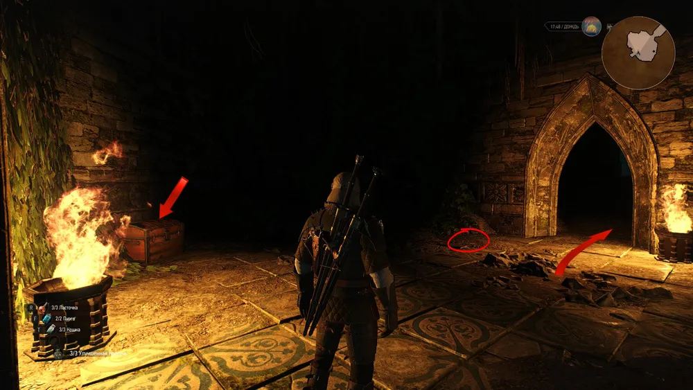 3. В небольшом помещении, куда Геральт попадет, пройдя через портал, он заметит валяющееся на полу перо совы – свидетельство того, что Филиппа здесь была. Ищите его с включенным ведьмачьим чутьем впереди и слева от портала (осмотр пера опционален и на прохождение квеста не влияет).