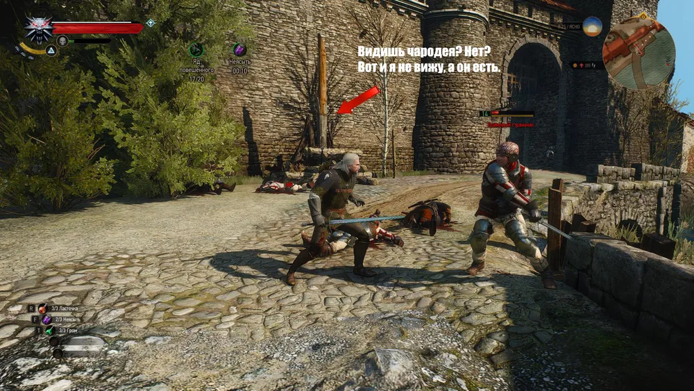 10. Воспользовавшись тем, что Трисс отойдет чуть в сторону, Дийкстра примется расспрашивать Геральта касательно его дальнейших планов в отношении рыжеволосой чародейки. Можете ответить ему, как угодно. Все равно ни поругаться всласть, ни потрепаться наши герои не успеют: появятся охотники за колдуньями, человек примерно пять-семь (14 уровень). С криком: «Живьем брать демонов!» (пасхалка на советскую комедию «Иван Васильевич меняет профессию»), они ринутся в бой.