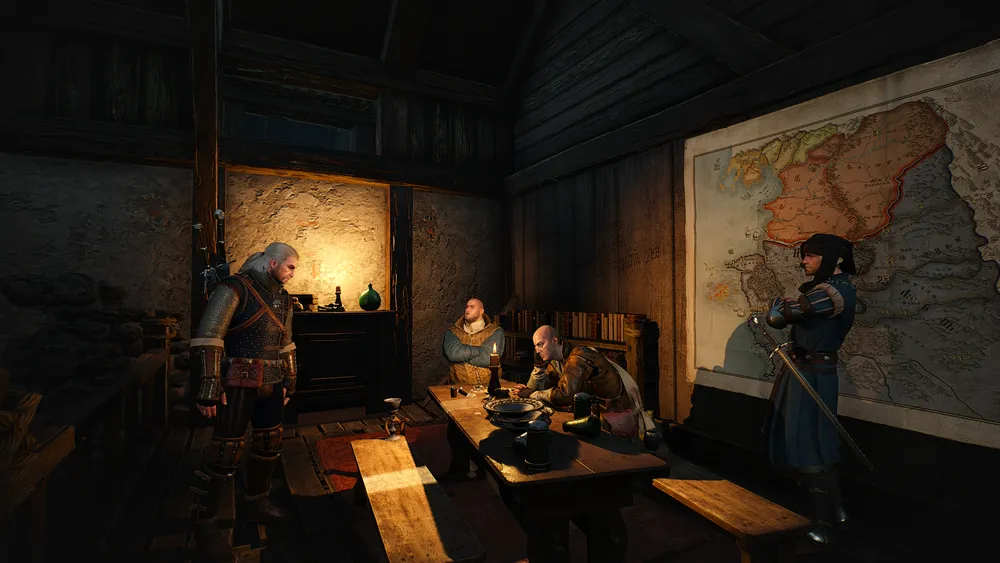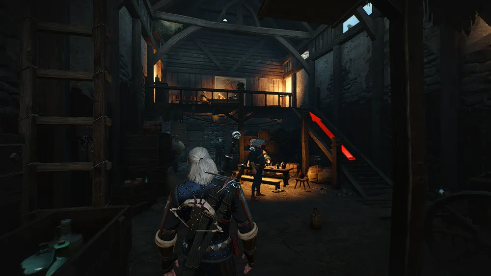 К моменту появления Геральта на складе Дийкстра, Вернон Роше и Талер уже будут там. Как только ведьмак поднимется на второй ярус и приблизится к столу, за которым расселись заговорщики, начнется катсцена с диалогом.