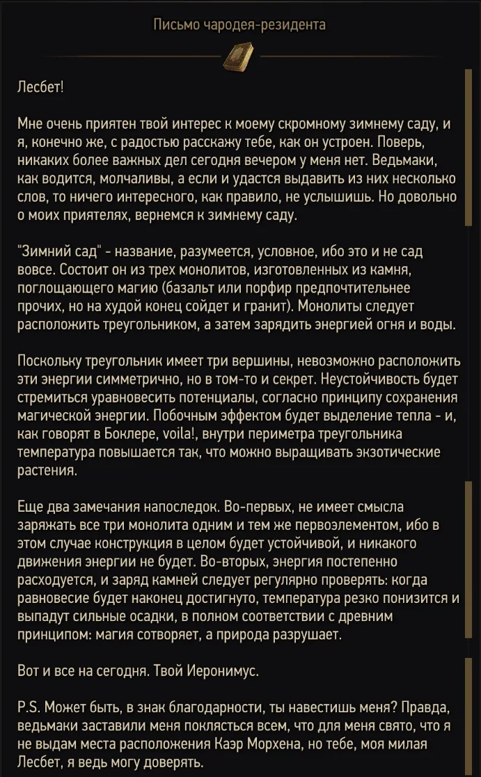 Если вы торопитесь выполнить данный квест, то осмотр менгиров, ящиков из-под рассады, серпа, а также поиски письма можно запросто пропустить. Сразу же, найдя место бывшей магической теплицы, активируйте менгиры знаками, убейте появившегося чёрта, и через два дня полюбуйтесь на разросшиеся буйным цветом ведьмачьи травки. Кстати, письмо чародея, скрытое иллюзией, можно будет найти, забрать и прочитать уже после окончания квеста.