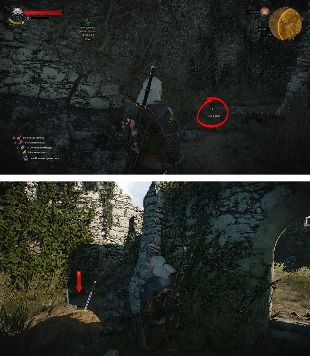 Интересно. Записка Азара Яведа – не единственная отсылка к событиям первой игры серии, с которой нам предстоит столкнуться в окрестностях Каэр Морхен. К югу от крепости есть каменное надгробие (8) с воткнутым в него мечом. Осмотрите его, и Геральт сообщит, что это могила Лео – воспитанника Весемира, трагически погибшего при попытке помешать Яведу и Профессору выкрасть ведьмачьи секреты.
