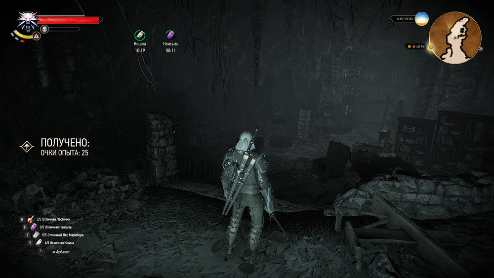 По иронии судьбы сейчас там обитают монстры: накеры-воины и пожиратель 12 уровня. Перебейте их и ступайте в дальний конец пещеры. При попадании в ту ее часть, которую Геральт назовет лабораторией, игра засчитает вам выполнение квеста и отсыплет 25 опыта вне зависимости от уровня героя.