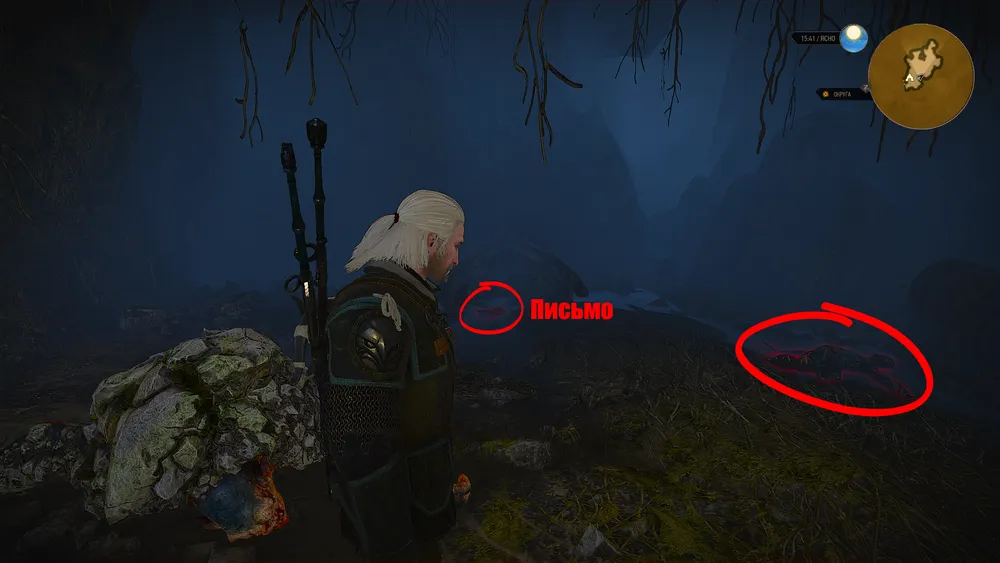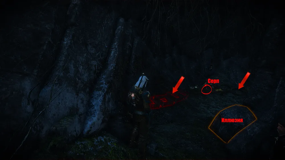 2. (опционально) Первым делом игра предложит осмотреть место погодной аномалии. Начнем с менгиров: от камней исходит магия, которая, похоже, влияет на ауру этого места. Слева от дальнего менгира торчит каменная колонна естественного происхождения, поддерживающая каменный козырек, под которым когда-то располагалось нечто, напоминавшее агротехническую лабораторию. У подножия самой колонны есть место, защищенное иллюзией. Иллюзию развеиваем глазом Нехалены; ящики с остатками рассады и ржавый серп, воткнутый в деревянный помост рядом со скляночками и баночками, осматриваем с применением ведьмачьего чутья. По итогам проведенного осмотра Геральт сделает вывод: перед ним заброшенный аптекарский огородик, где давным-давно выращивали редкие травы для ведьмачьих эликсиров. Если суметь правильно воздействовать на менгиры, его, в принципе, можно возродить. А вот как именно воздействовать, подскажет письмо чародея-резидента, обнаруженное за иллюзией. Читаем его, хотя это и опционально.